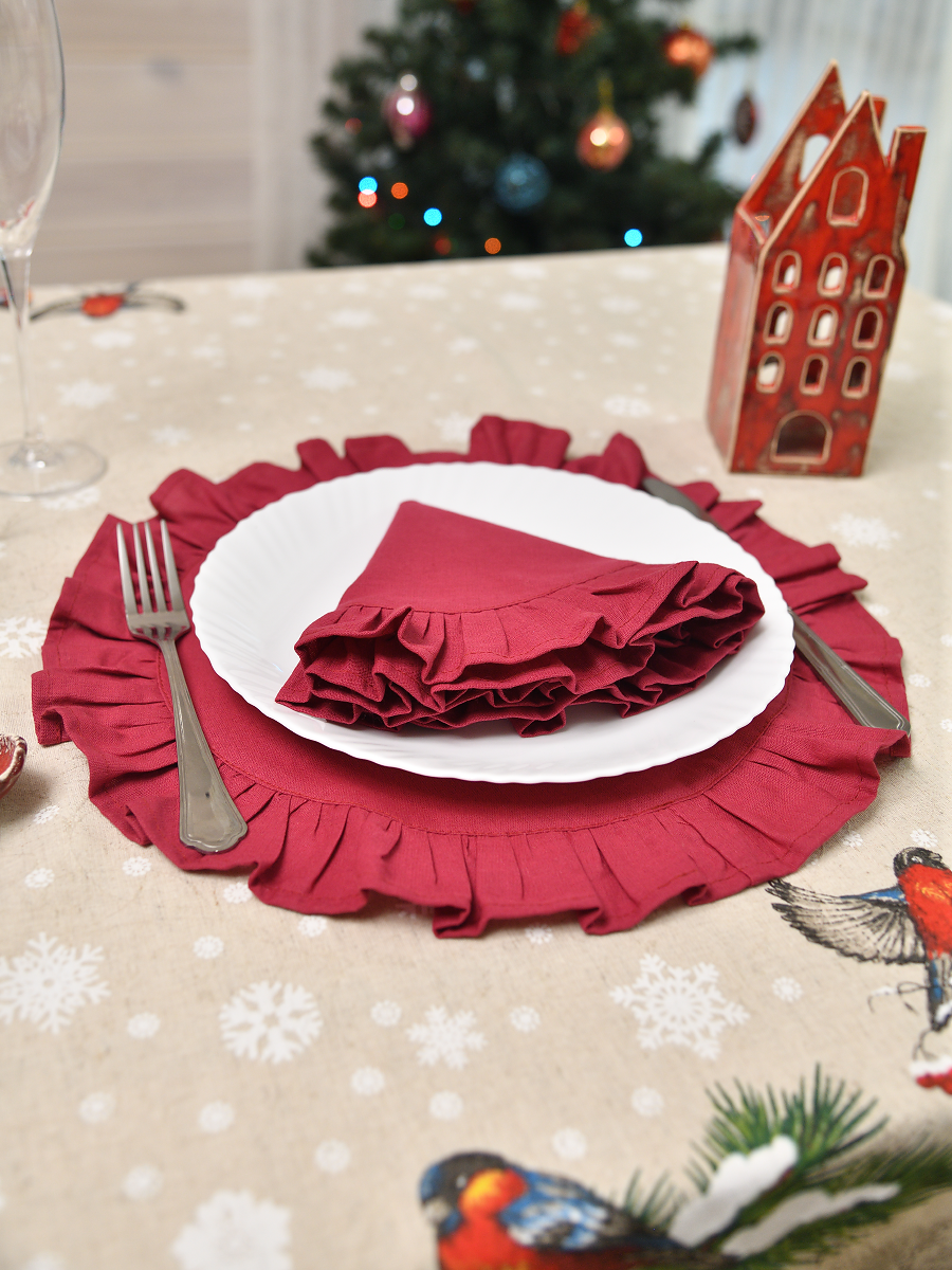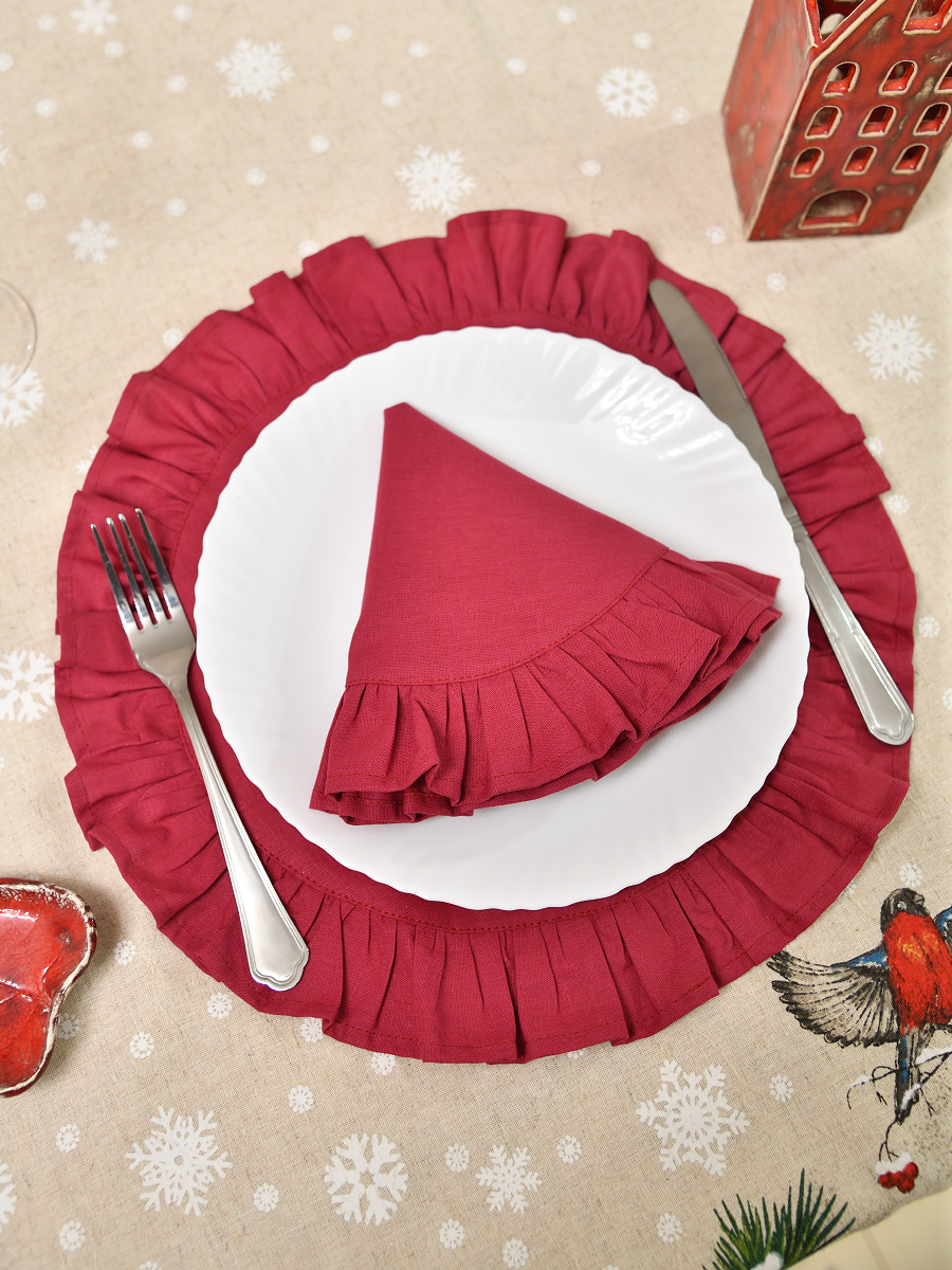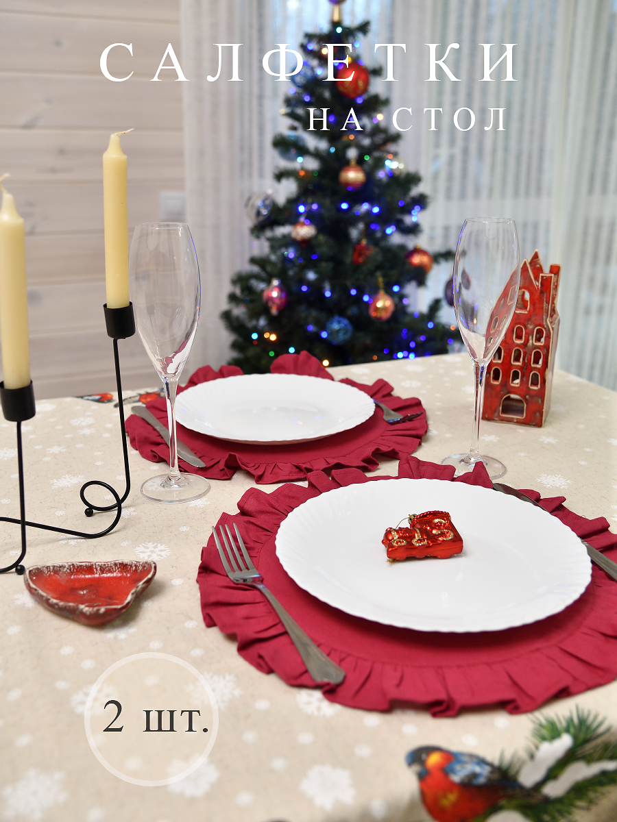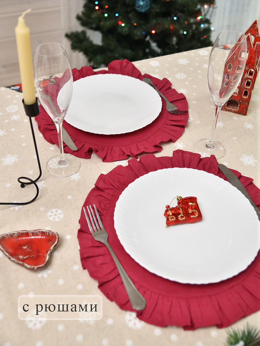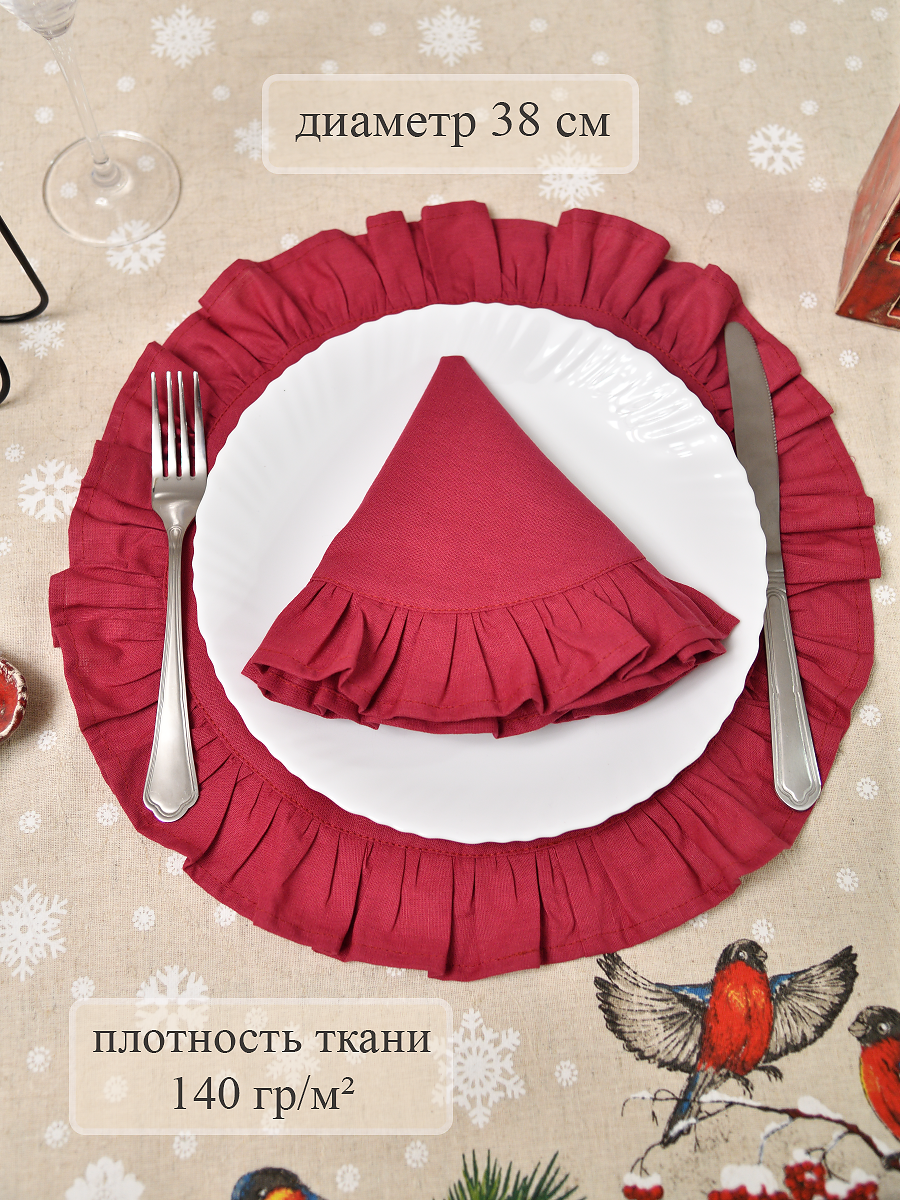 Эти стильные плейсматы в духе Pinterest выполнены из натуральной ткани — 50% лен, 50% хлопок, плотностью 140 г/м2 — и украшены изящными рюшами. Диаметр салфеток 38 см. Бордовый цвет гармонирует с любой посудой и подчёркивает эстетику подачи блюд, а также добавляет уютной новогодней и праздничной атмосферы.