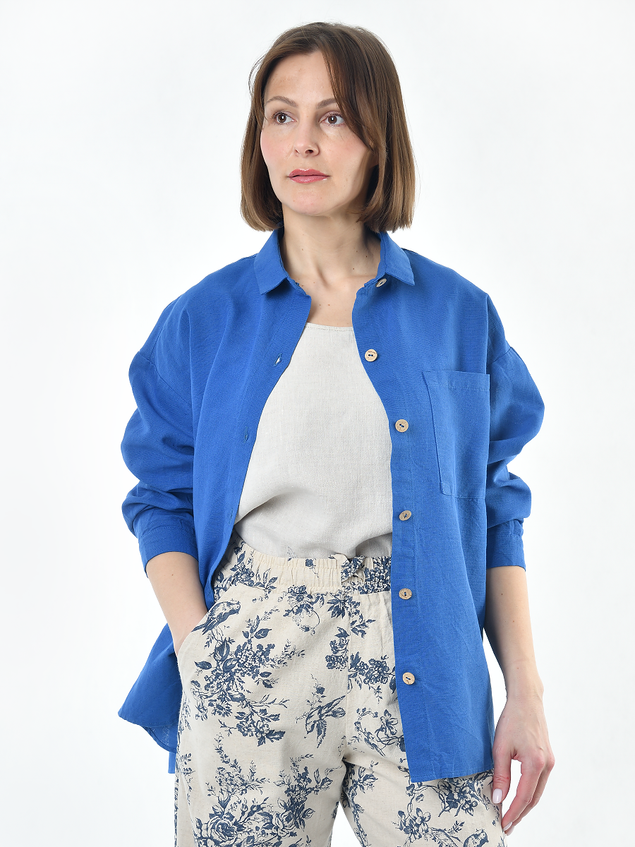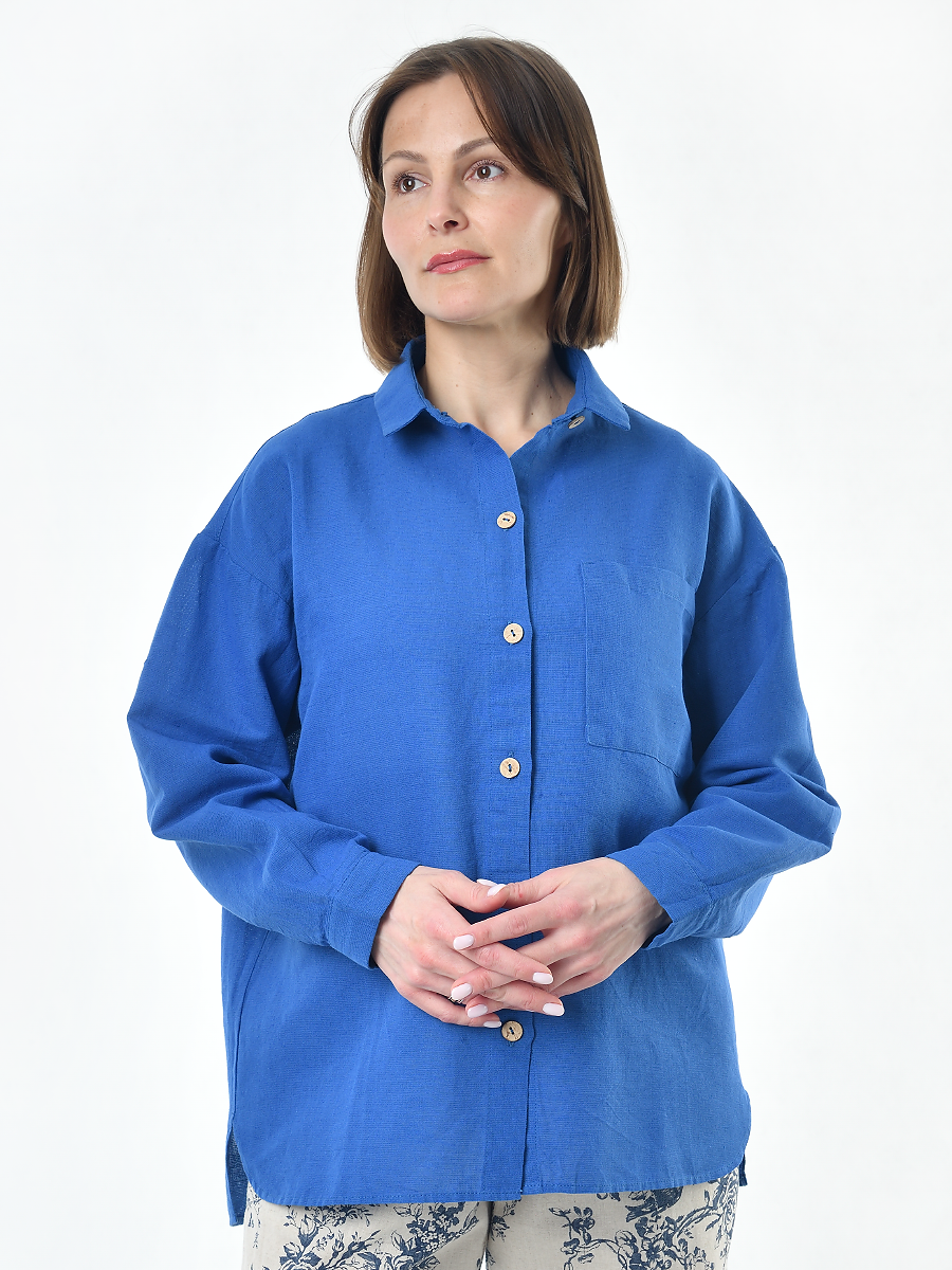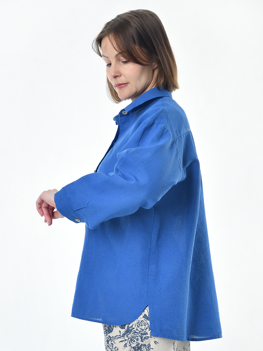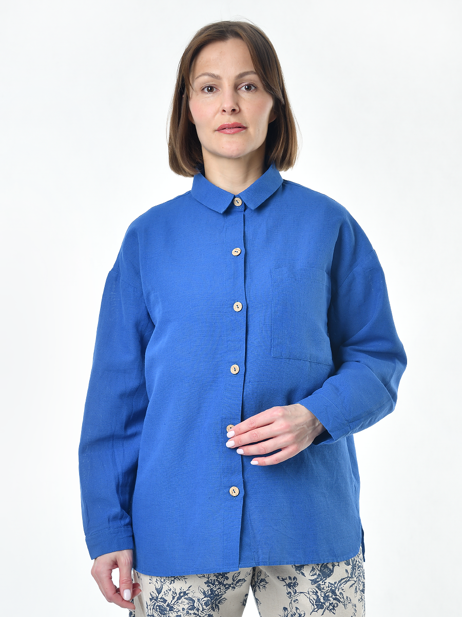Блузка женская из льна #046, цвет светло-синий, изготавливается из ткани с составом 50% лен, 50% хлопок. После изготовления блузка проходит процесс химического умягчения.