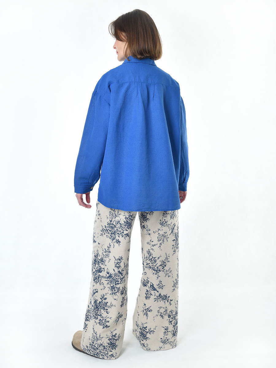 Блузка женская из льна #046, цвет светло-синий, свободного силуэта, с центральной застежкой – цельнокроеной планкой, застегивается на обметанные петли и пуговицы. На полочке имеется накладной карман. Спинка выполнена с кокеткой, из которой выходит бантовая складка в центре спинки. Рукав одношовный, выполнен с манжетой, застегивающейся на петлю и пуговицу. Воротник отложной со стойкой, в боковых швах разрезы, по полочке скругленные, по спинке прямые. Отделочные строчки проложены по шву притачивания нижней части спинки и кокетки и по шву притачивания манжеты к рукаву.