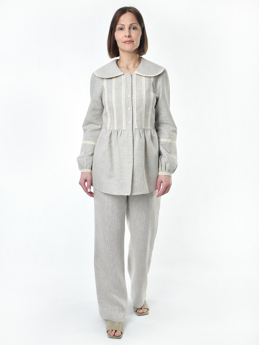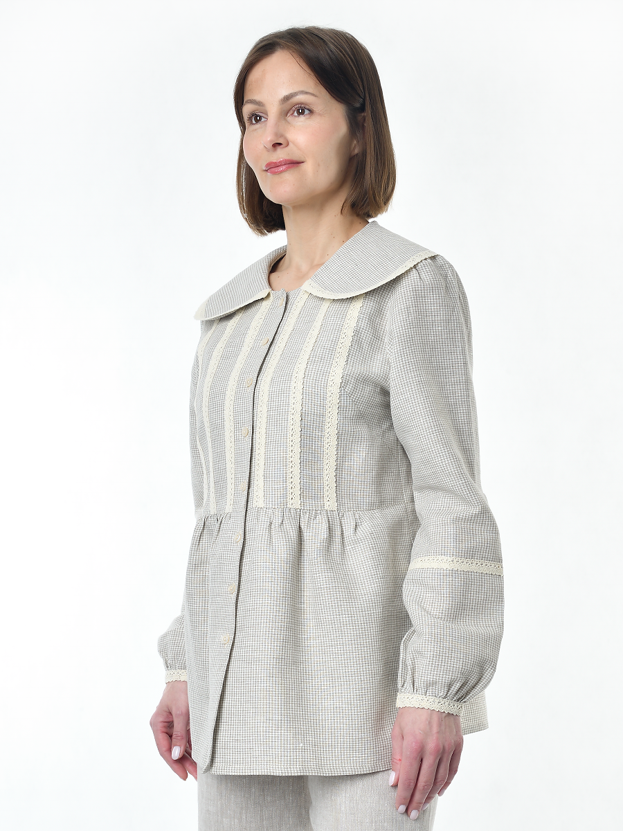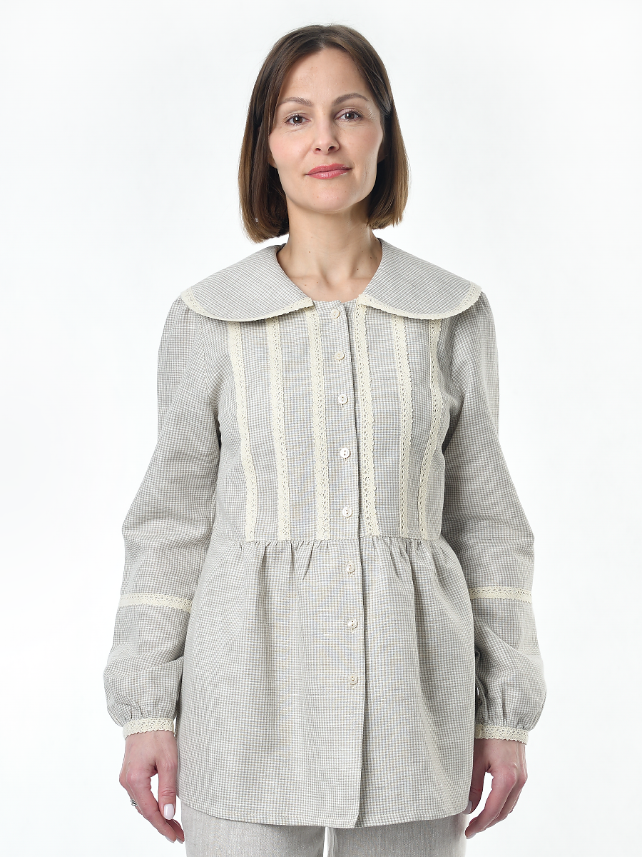 Блузка женская из льна #060, ткань бежевая клетка