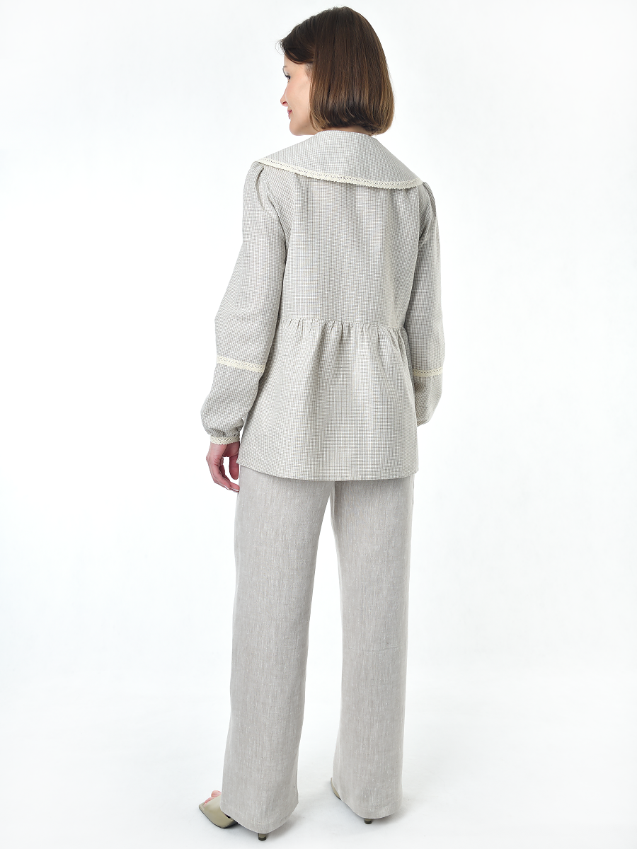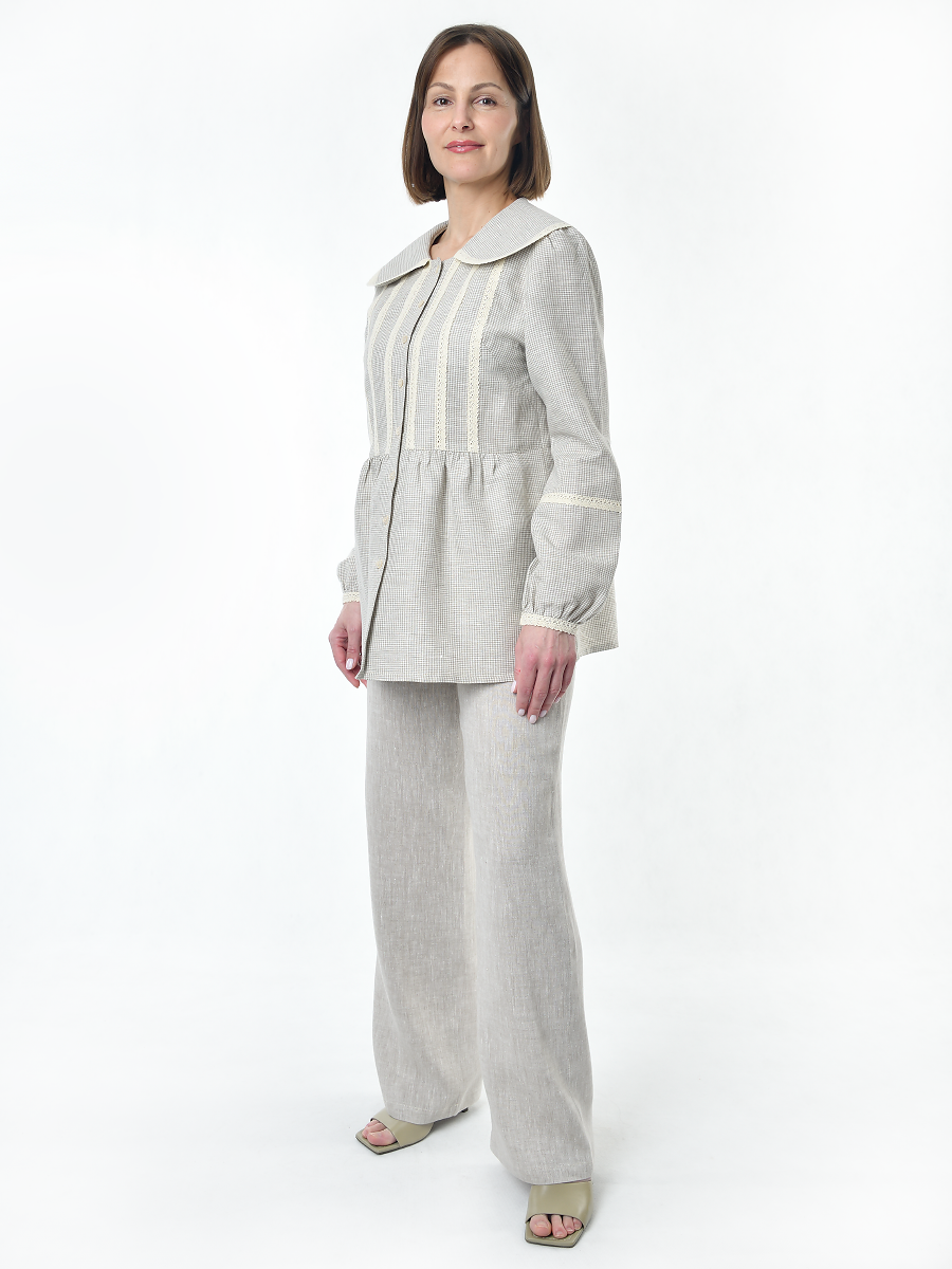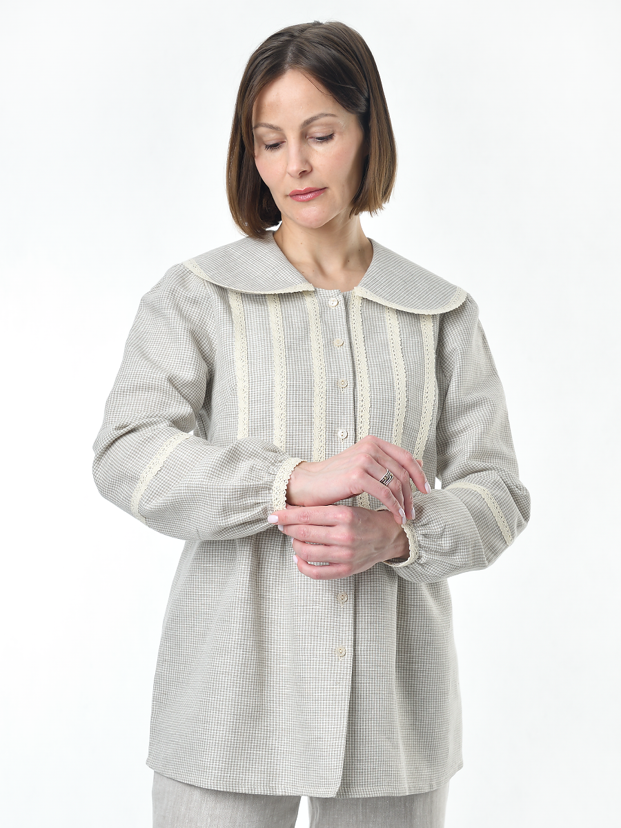 Блузка женская из льна #060, ткань бежевая клетка