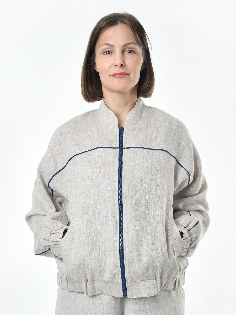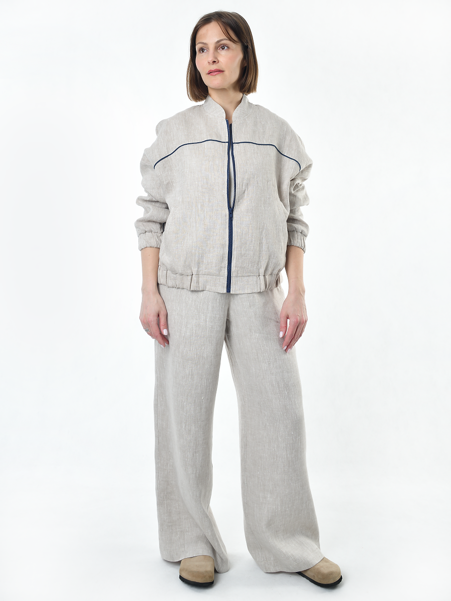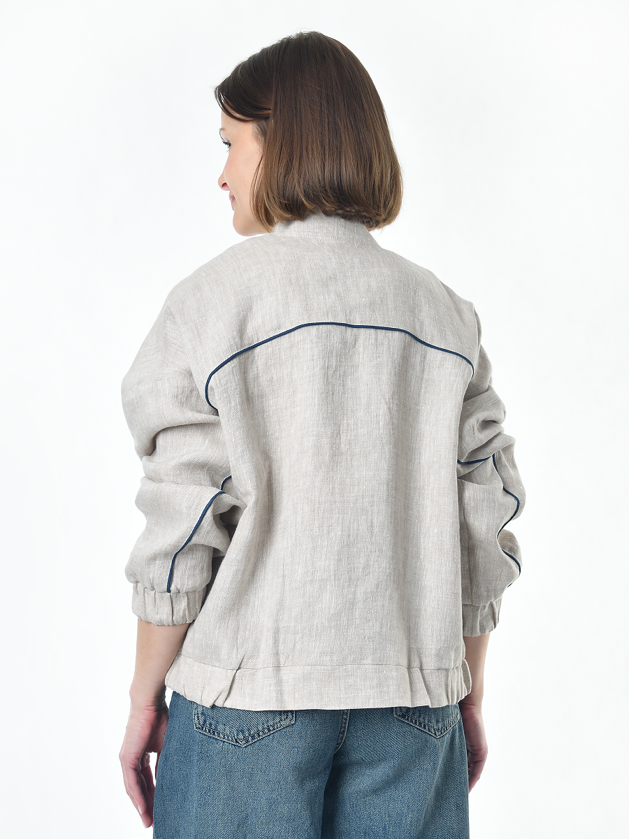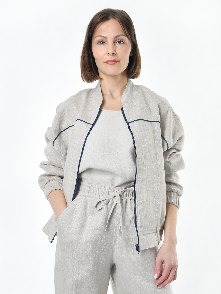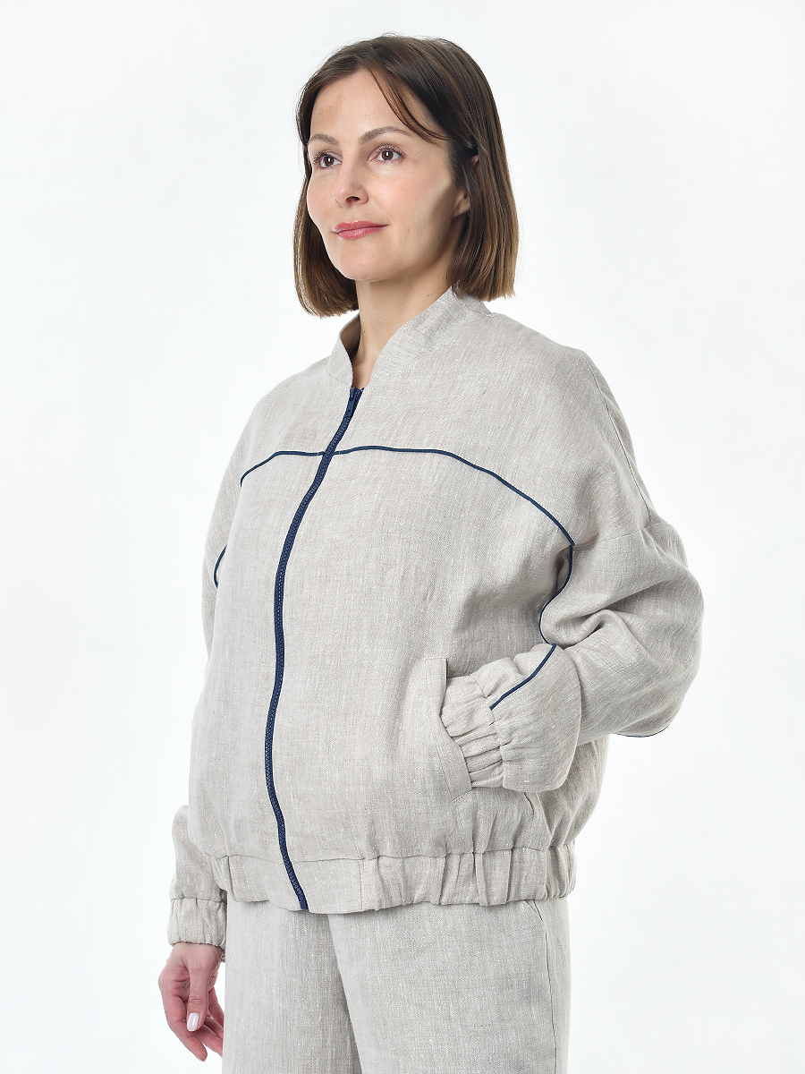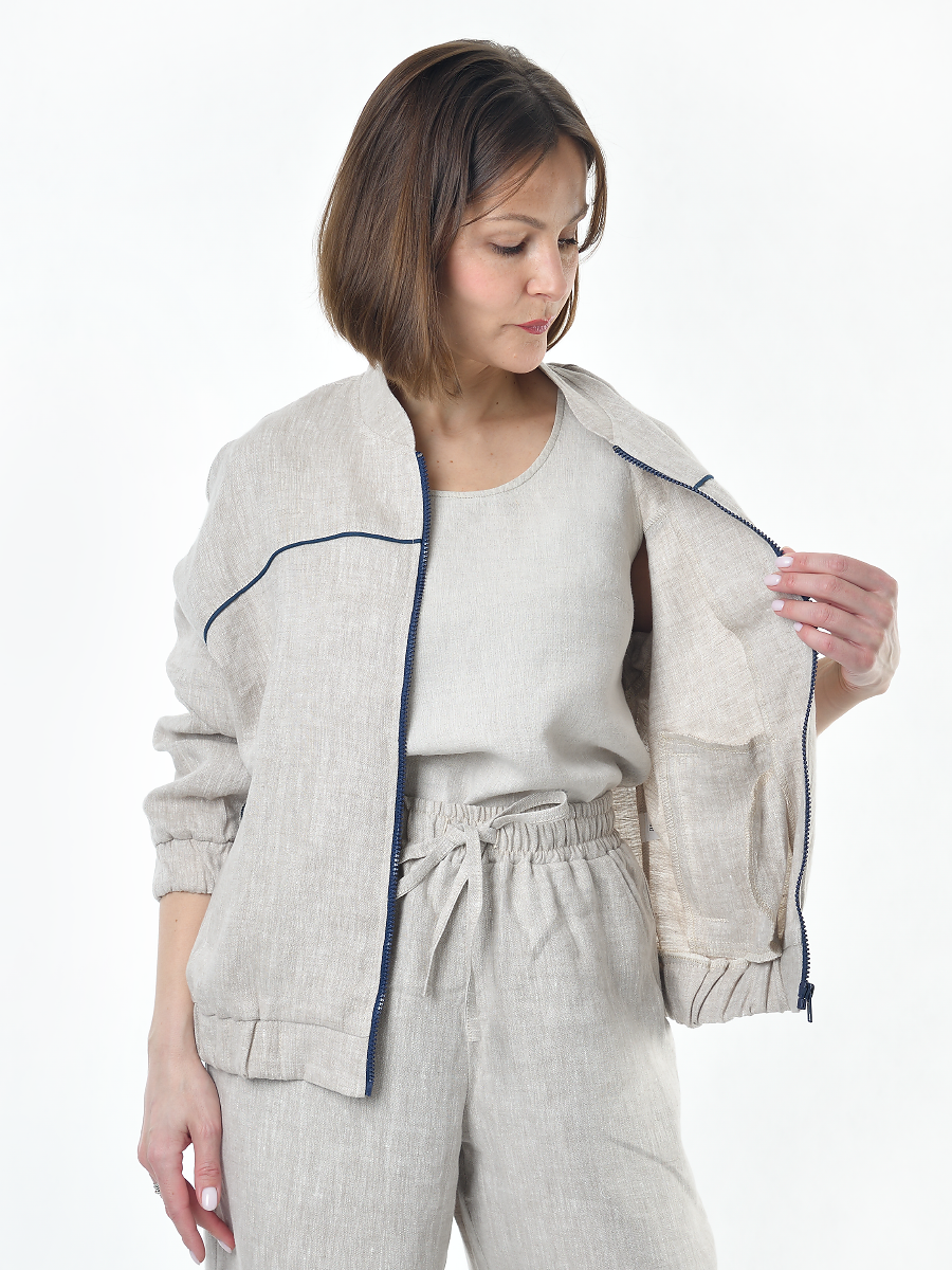 Жакет выполнен из ткани с составом 50% лен, 50% хлопок.