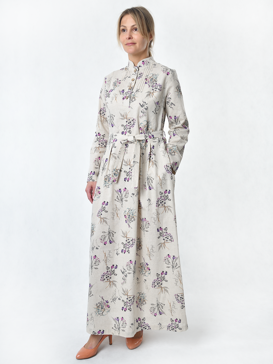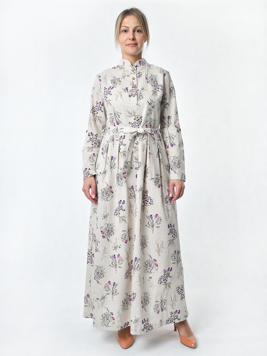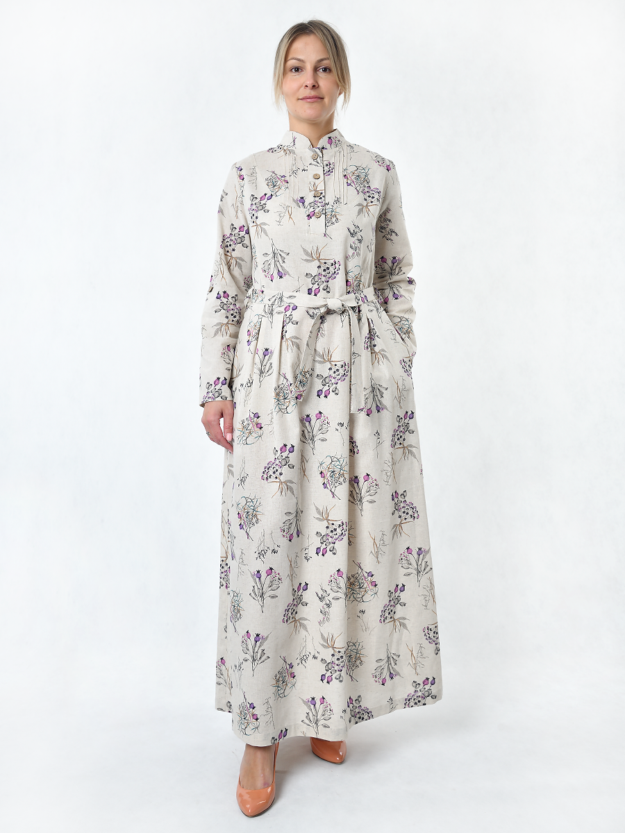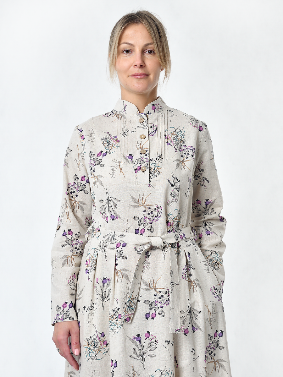 Платье льняное женское #025 "Маков спас" полуприлегающего силуэта, отрезное по линии талии, застежка планка чуть ниже линии груди, с карманами в боковых швах, с втачным одношовным рукавом, с поясом. Полочка с отрезными бочками и фигурной кокеткой с вертикальными защипами. Спинка с отрезными бочками. Нижняя часть платья со складками. Длина рукава корректируется с помощью паты. В боковых швах имеются шлевки под пояс. Воротник стойка.
