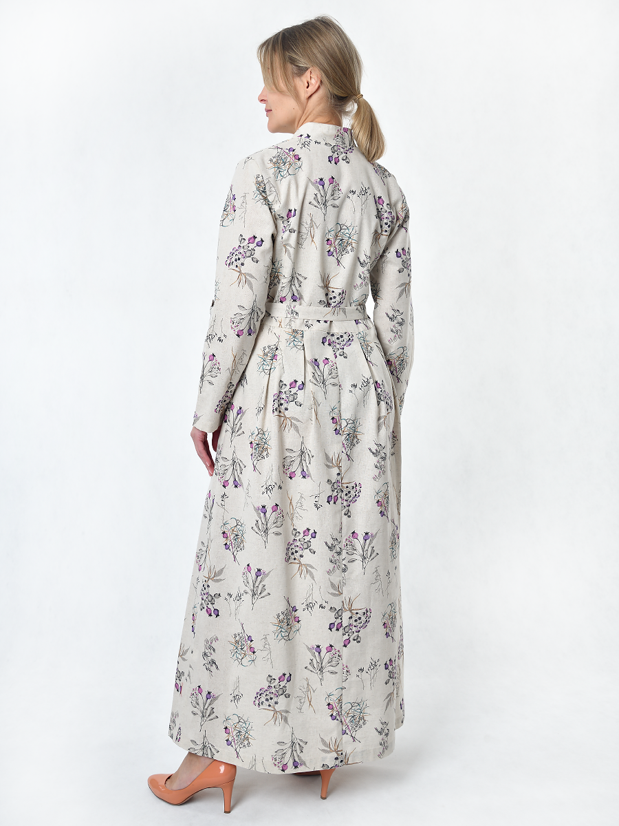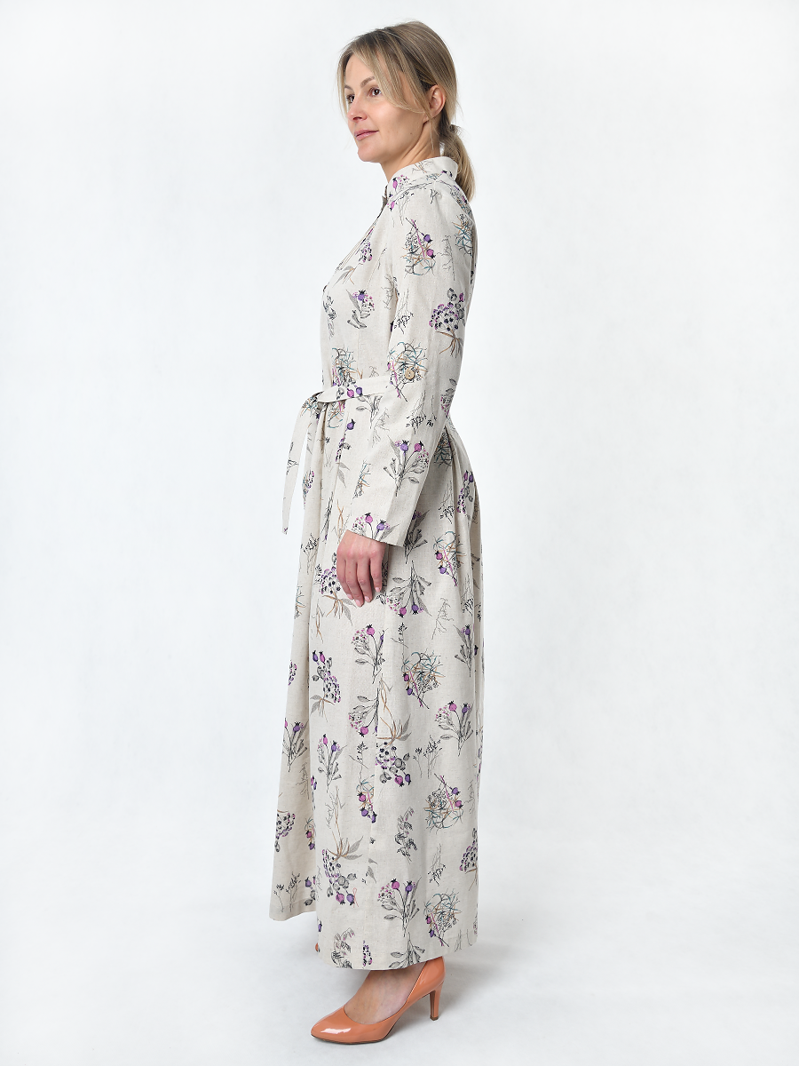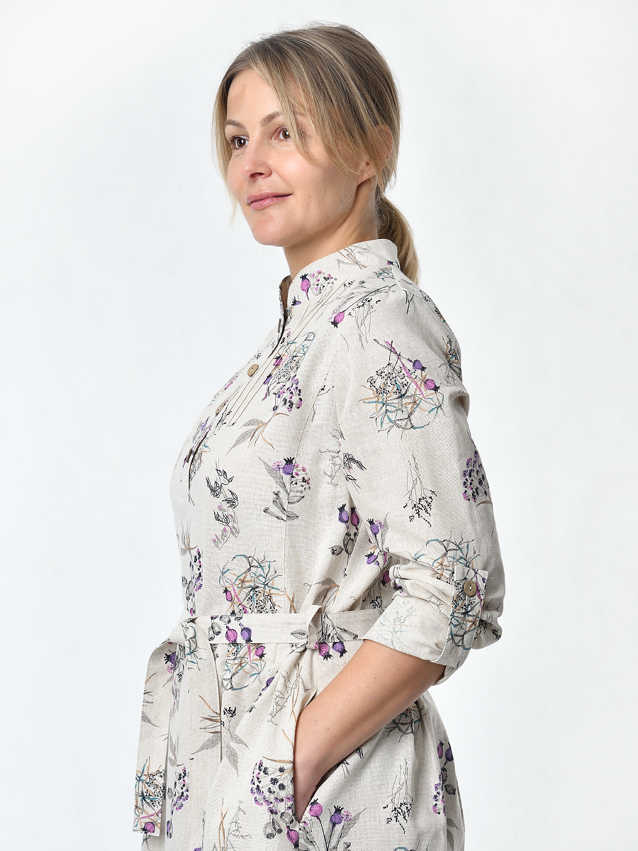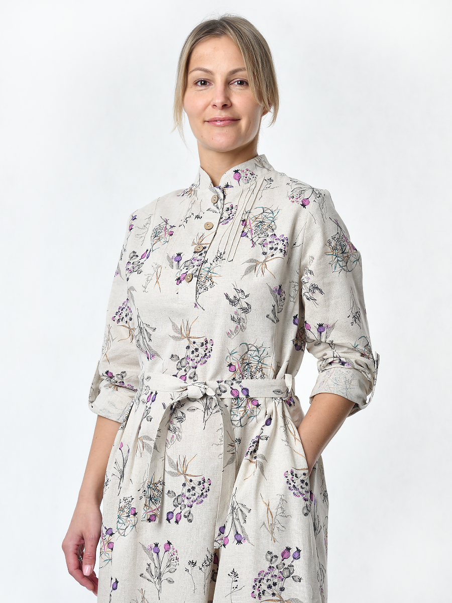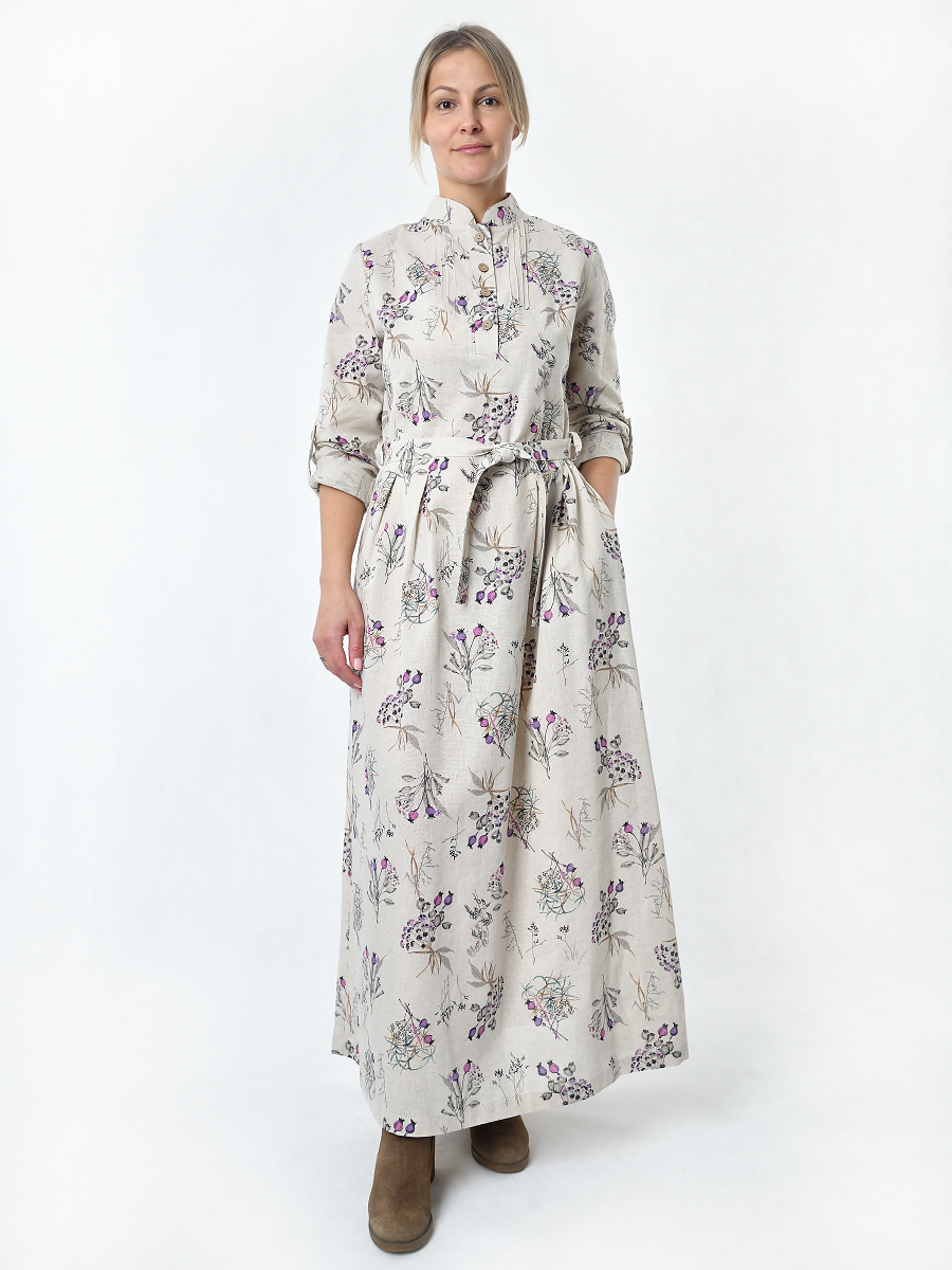 Платье льняное женское #025 "Маков спас" полуприлегающего силуэта, отрезное по линии талии, застежка планка чуть ниже линии груди, с карманами в боковых швах, с втачным одношовным рукавом, с поясом. Полочка с отрезными бочками и фигурной кокеткой с вертикальными защипами. Спинка с отрезными бочками. Нижняя часть платья со складками. Длина рукава корректируется с помощью паты. В боковых швах имеются шлевки под пояс. Воротник стойка.