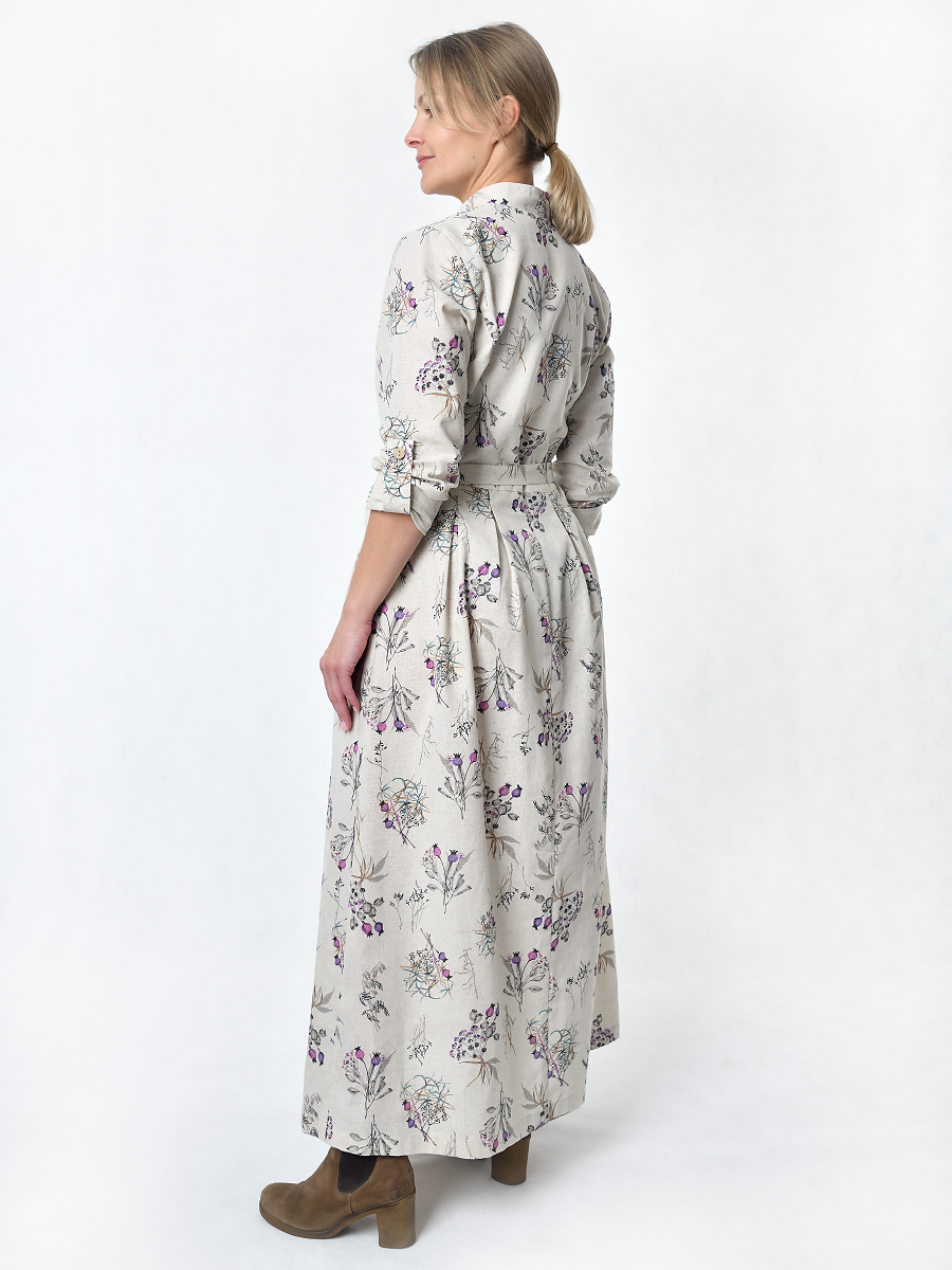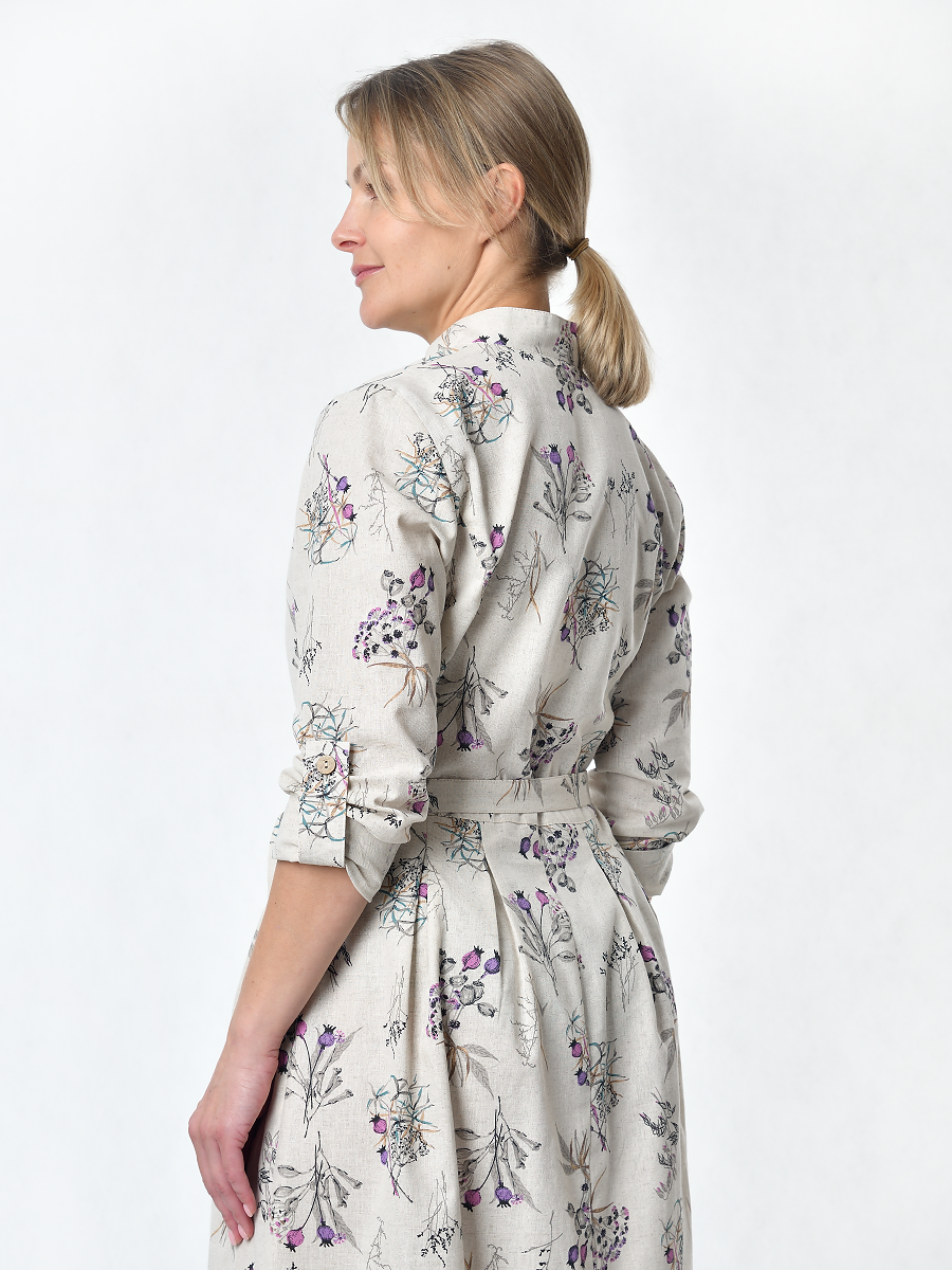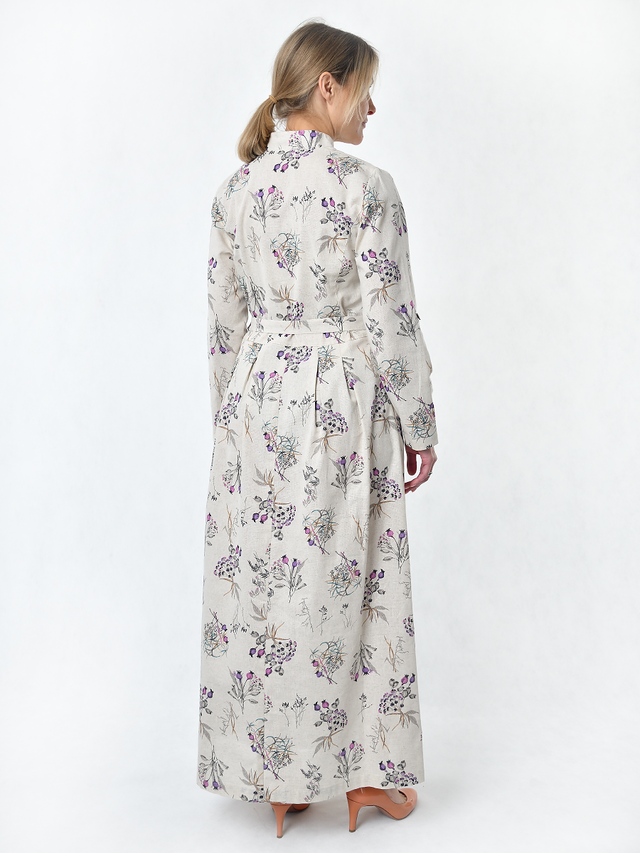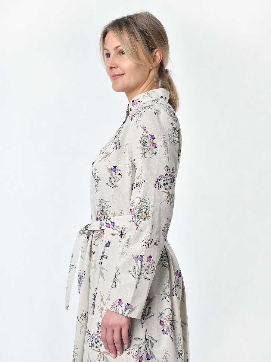 Платье льняное женское #025 "Маков спас" полуприлегающего силуэта, отрезное по линии талии, застежка планка чуть ниже линии груди, с карманами в боковых швах, с втачным одношовным рукавом, с поясом. Полочка с отрезными бочками и фигурной кокеткой с вертикальными защипами. Спинка с отрезными бочками. Нижняя часть платья со складками. Длина рукава корректируется с помощью паты. В боковых швах имеются шлевки под пояс. Воротник стойка.