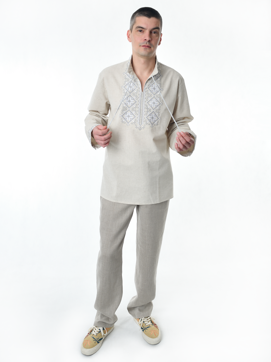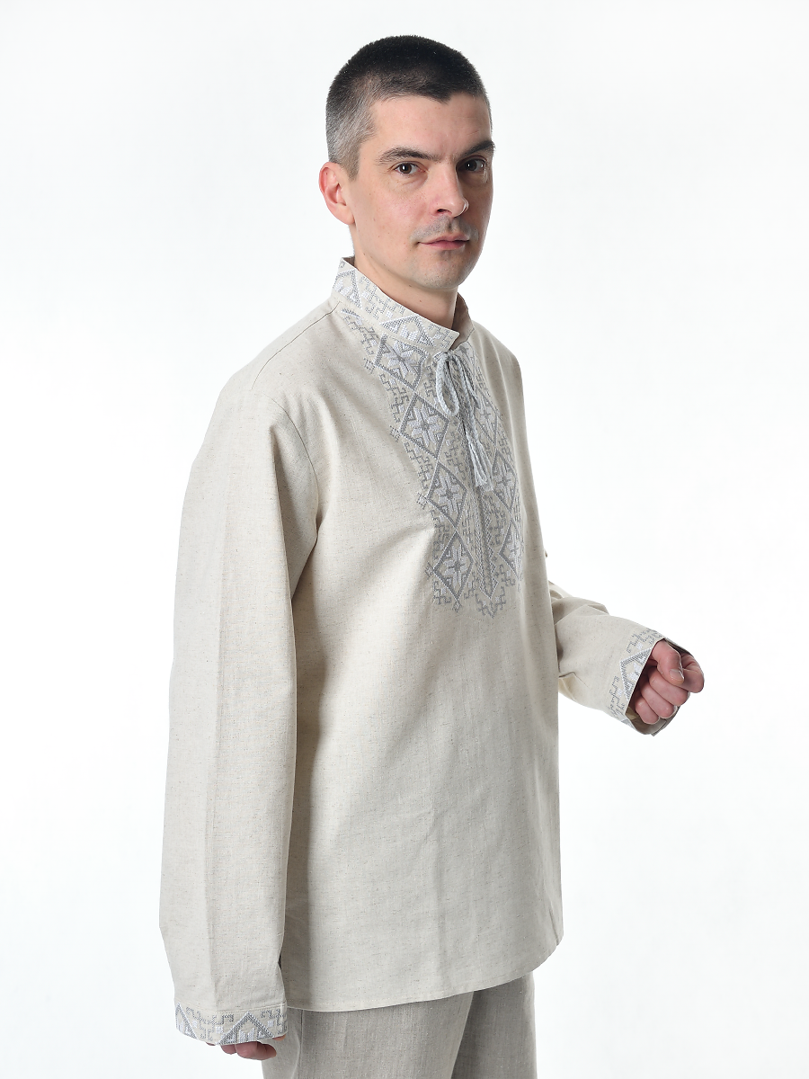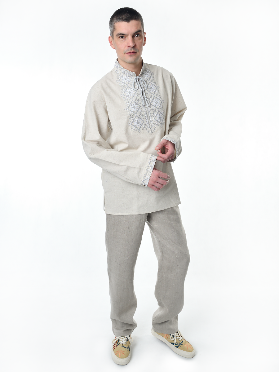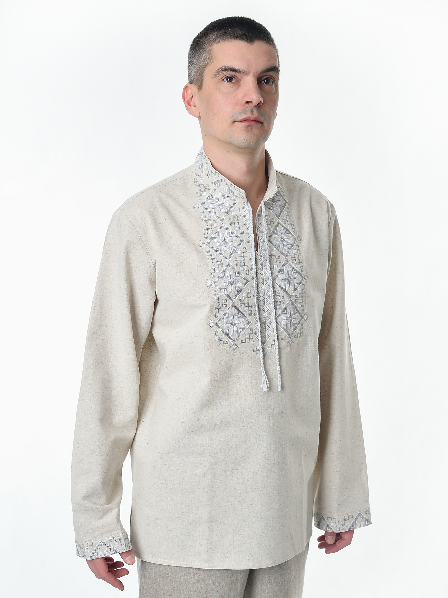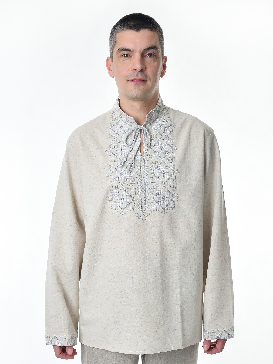 Рубашка льняная мужская, с вышивкой, светло-серая изготавливается из ткани с составом лён 100%.