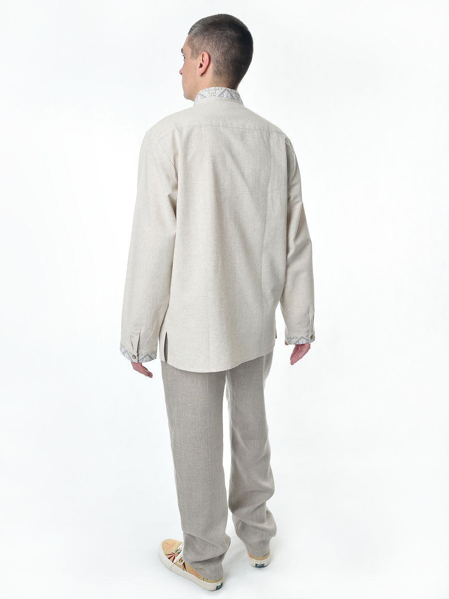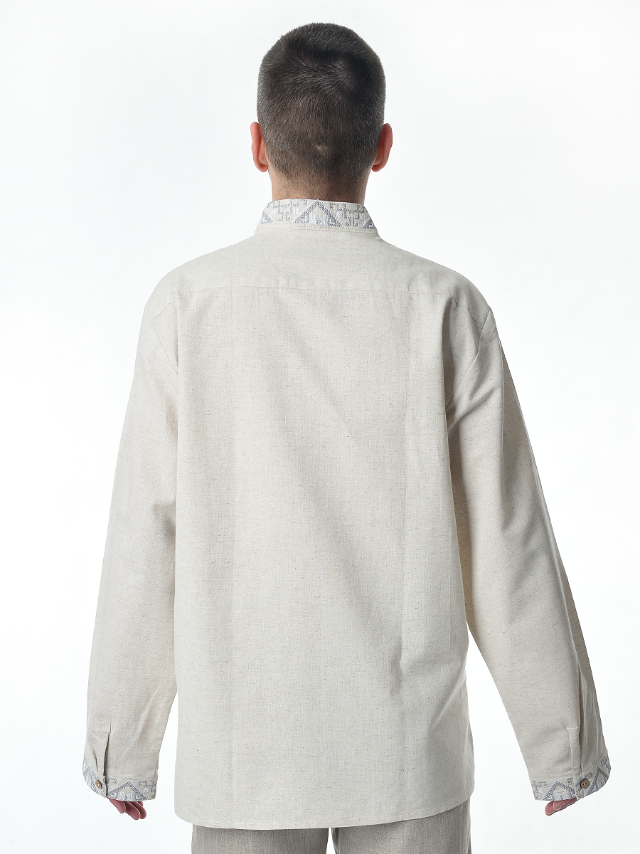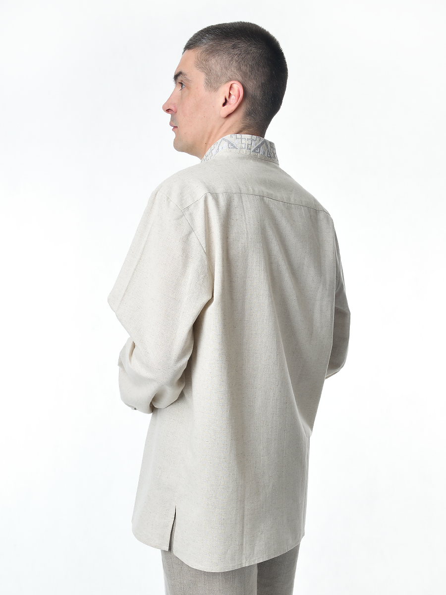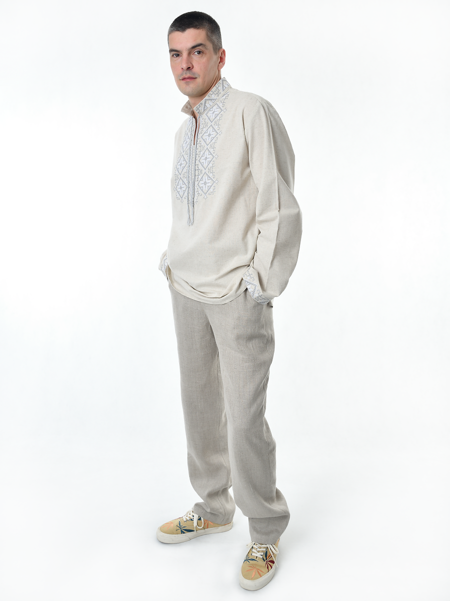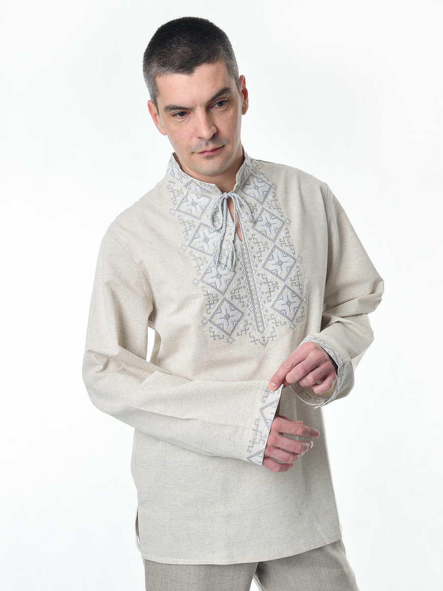 Рубашка льняная мужская, с вышивкой, светло-серая